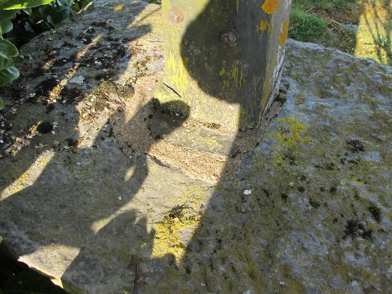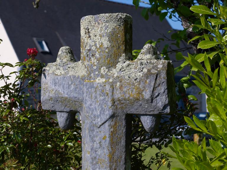 Croix latine sur soubassement de maçonnerie comportant une niche à statuette et couvert d'une dalle de schiste ; branches horizontales recroisetées. Le fût chanfreiné, de même que la croix, comportait probablement une base empattée si l'on en juge la forme de l'encoche destinée à recevoir la croix dans la dalle ; cassé comme on le voit sur le dessin de l'abbé Gougeon, il a été consolidé. Décor en bas relief à la croisée : écusson muet, mais qui portait peut-être les armes de la famille des Castellan.