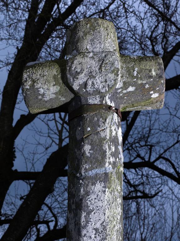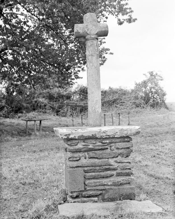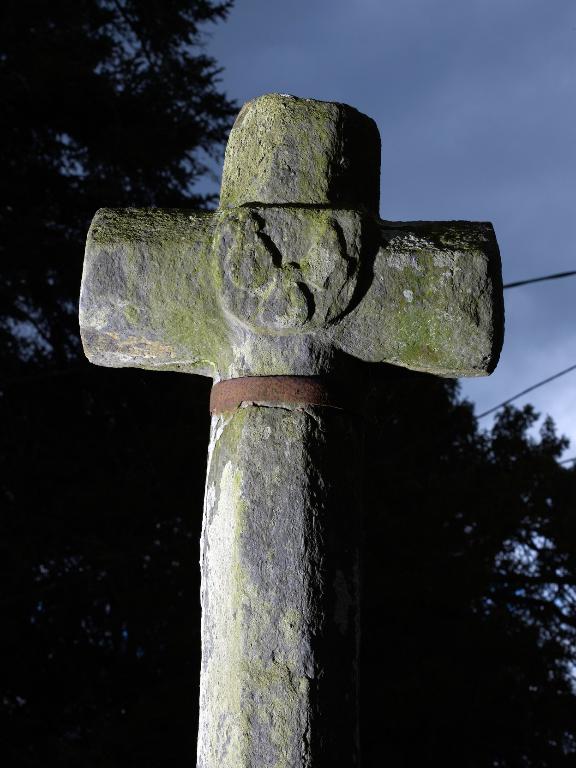 Croix latine en granite sur soubassement de maçonnerie couvert d'une dalle de schiste. Décor sur chaque face, à la croisée : écusson portant trois coquilles ou les armes de Bretagne (?) : trois hermines . Sur le soubassement, à l'ouest une pierre porte une date gravée : 1886, dans un cartouche encadré de deux écussons muets (?).