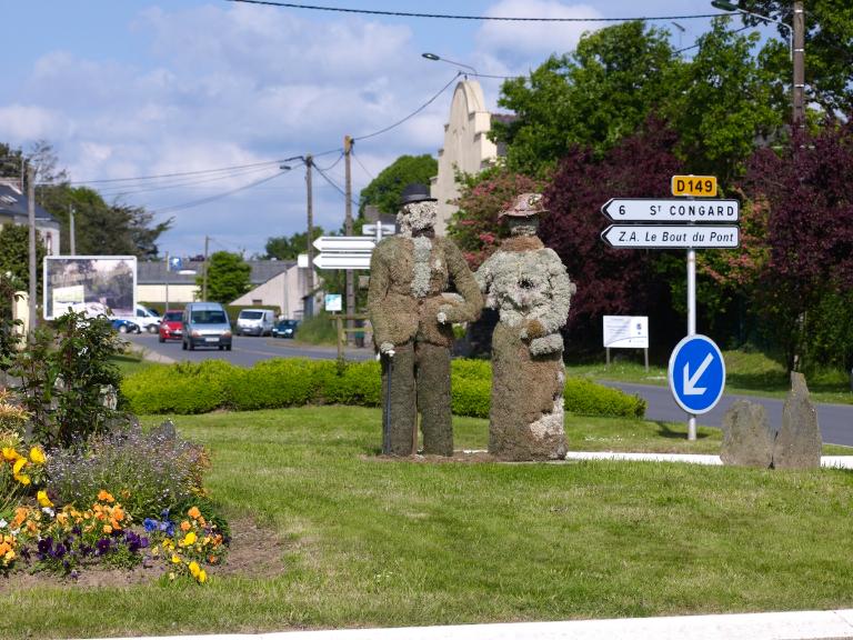 Croix latine en granite sur soubassement de schiste couvert d'une dalle de schiste au profil mouluré. Fût monolithe de section octogonale. Décor : quatre trous, dans la partie inférieure du fût, représentent les plaies du Christ ; la face qui porte ces trous est celle qui est contre le mur. Le fût a été raccourci. D'abord le long de l'avenue de la Libération (on la voit sur une carte postale du début du 20e siècle), elle a été remontée vers l'an 2000 dans la rue du Commerce.