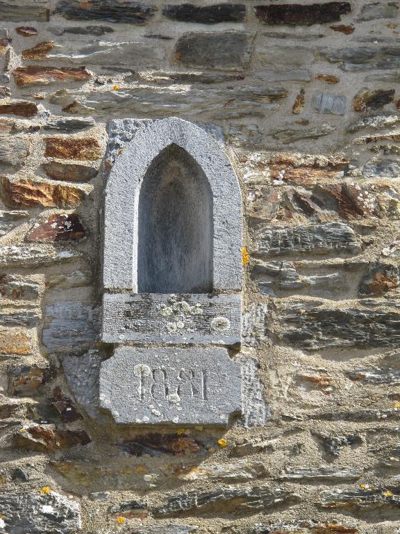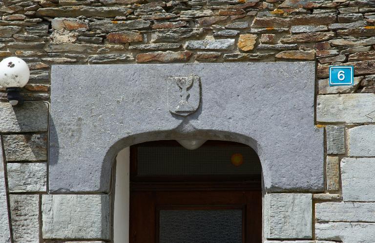 Édifice de plan rectangulaire ; rez-de-chaussée surmonté d’un étage carré et d’un comble à surcroît à lucarne passante à pignon, formant travée avec les portes ; enduit supprimé (?) ; piédroits des baies en pierres de schiste calibrées ; niche à statuette en schiste au-dessus de la travée de la porte de droite.