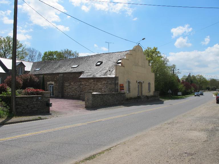 Salle paroissiale de plan rectangulaire perpendiculaire à la rue, construite en 1949 ; le logement de l’instituteur fait le lien entre les deux bâtiments, après avoir perdu les deux travées de baies occidentales. Moellons de schiste et grès ; rez-de-chaussée surmonté d'un comble. Façade sur rue entièrement enduite, ouverte d'une porte et de deux fenêtres aux encadrements en pierre de taille de granite ; fronton en "pas de moineau" (évoquant les marches d'un escalier), dont le pignon porte un décor en forme de croix. La salle a été entièrement construite par les paroissiens (cf. annexe).