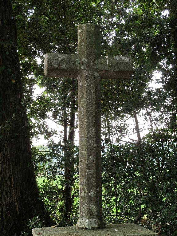 Croix latine de granite, monolithe sur soubassement de maçonnerie couvert d'une dalle de granite moulurée. Fût monolithe de section octogonale à griffes. Aucun décor.
