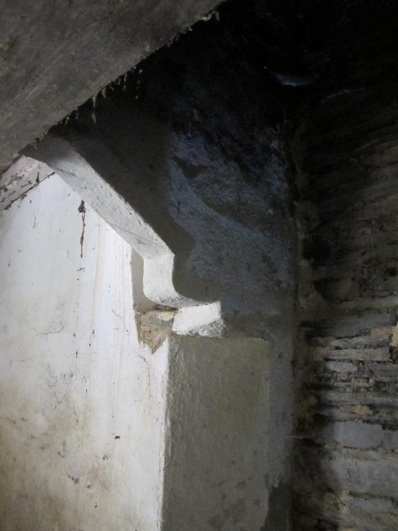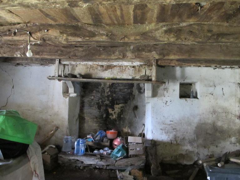 Logis de plan allongé à deux pièces symétriques ; rez-de-chaussée surmonté d’un surcroît à lucarne rampante (19e siècle) formant travée avec la porte du logis dont le linteau est en schiste ; fort coyau ; cheminée ouest en schiste, dont les consoles sont indépendantes des sommiers ; cheminée en bois (19e siècle) ; escalier en vis dans une tour demi-hors œuvre postérieure.