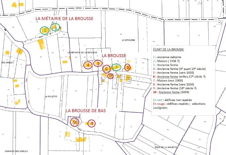 Au sud, la Brousse de Bas rassemblait deux bâtiments plus anciens : à l’ouest, une ferme (10, sélectionnée) est datée 1699 ; à l'est, une ferme (9), dont la construction peut remonter au 18e siècle.