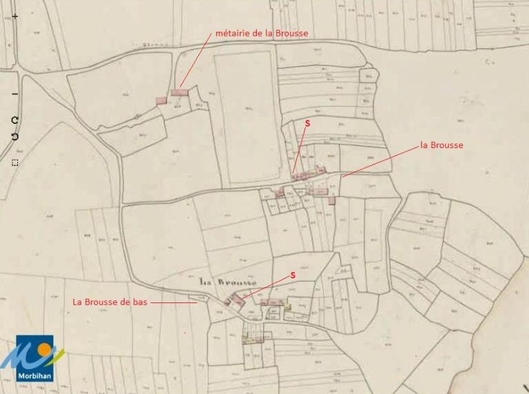 Au nord, la Métairie de la Brousse, entourée de vastes parcelles - ce qui offre un argument pour désigner cet endroit comme une métairie noble -, se composait de deux édifices (logis et dépendance ?) et d’un four à pain. Il n’en reste rien si ce n’est, dans un édifice en ruine (1), un mur en appareil mixte de poudingue, quartz et schiste, dont un moellon est daté 1773 ; ce même mur témoigne, dans l'utilisation du schiste, de la technique de maçonnerie en carreaux et boutisses. Le chemin qui traversait la cour de la métairie ouvrait directement, vers le nord, sur le « chemin du bourg à Glénac ». En 1936, une maison (2) a été construite en schiste provenant de la carrière de Caillibouis (renseignements oraux).