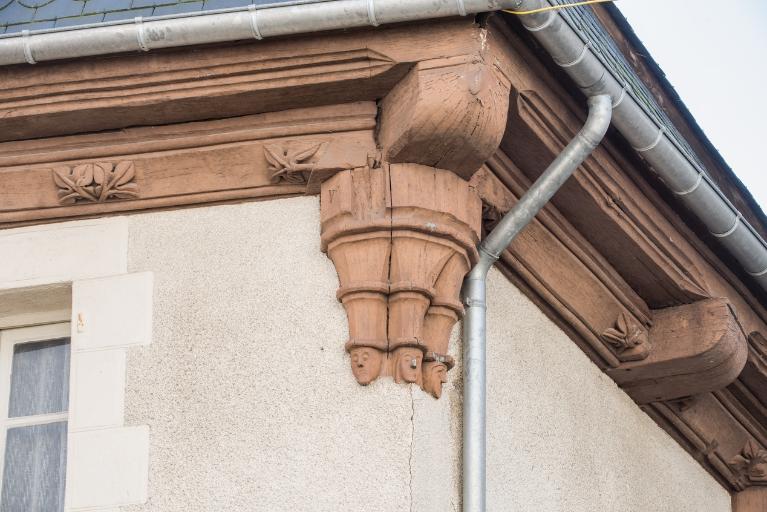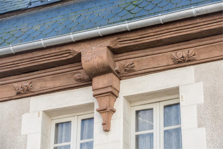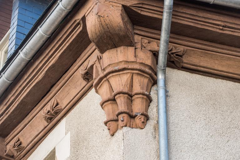 La structure en pan de bois est actuellement cachée par un enduit. Les entretoises décorées de feuilles sculptées et les consoles de type prismatique ornées de bagues moulurées, permettent une datation de la seconde moitié du XVe s. La tête du poteau cornier est orné de trois petits visages sculptés.
