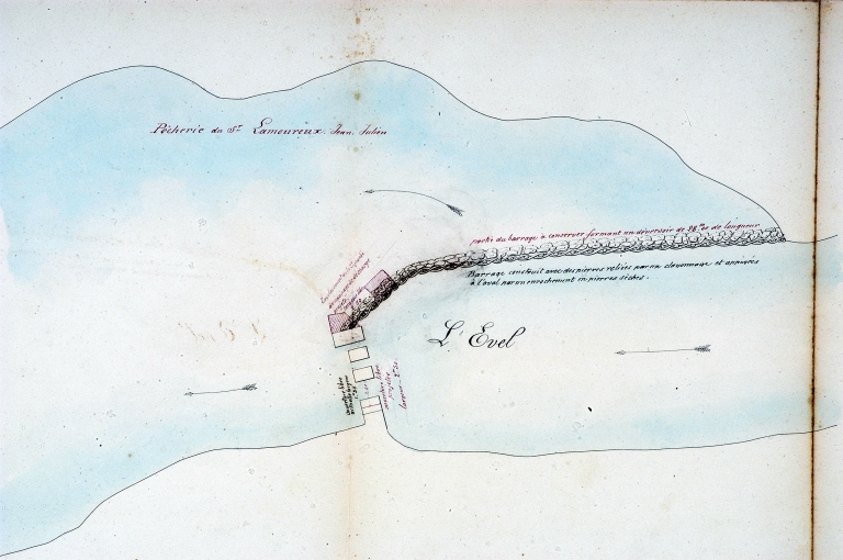 Le plan des pêcheries varie d'un exemple à l'autre. Le premier type de plan présente un massif en maçonnerie de pierres sèches reliant les deux rives de l'Evel et barrant complètement la rivière (cf. pêcherie de Kergouët). Le deuxième type de plan consiste en un massif établi perpendiculairement à une rive de la rivière, relié à la rive opposée par un barrage plus ou moins long (cf. pêcheries de Tréganin et de Botchosse). Le troisième type de plan présente une variante du type précédent : le barrage est formé de pieux reliés entre eux par des clayonnages ou fascines (cf. pêcheries de Tréganin). Les ouvertures ou pertuis sont au nombre de 1, 3, 4 suivant les cas. Ces ouvertures, ménagées dans le massif, sont les pêcheries elles-mêmes, dans lesquelles on place les guideaux, sorte de montants en bois destinés à maintenir les filets pendant les crues. Les textes du règlement d'eau nous apprennent également que les barrages avec des madriers sur les pertuis des pêcheries pouvaient servir de passage aux piétons désirant se rendre au bourg ou sur la rive opposée, que les voitures passaient parfois à gué à l'aval de la pêcherie.