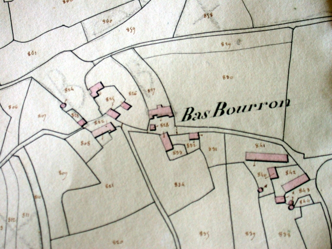 Cette ferme homogène est construite dans le premier quart du 19e siècle au Bourron Haut. Elle remploit une porte du 17e siècle à l'ouest, en bout d'alignement. L'alignement figure sur le cadastre ancien de 1829 sous la parcelle 794.
