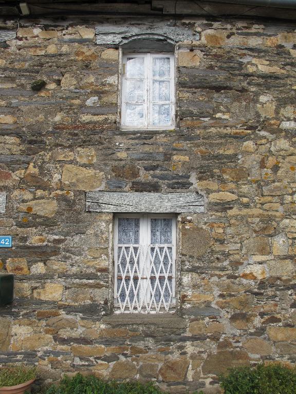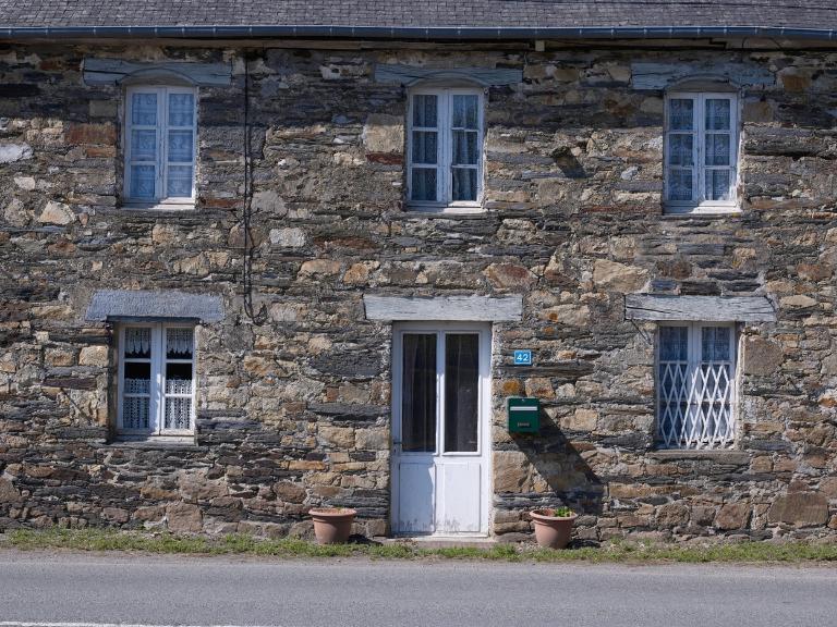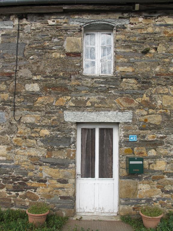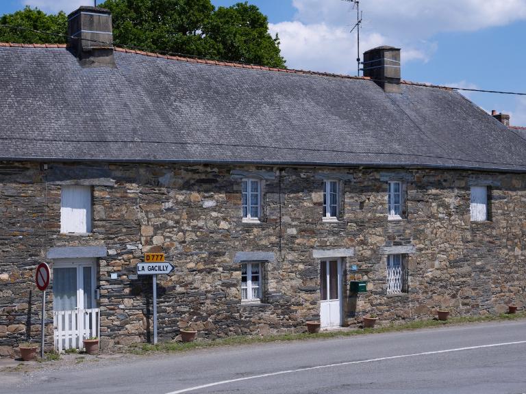 Le cadastre de 1825 montre un bâtiment isolé de même emprise que celui d’aujourd’hui, mis à part une longue dépendance sur la façade nord. Il se présente sous la forme d’un rectangle simple en profondeur. Maçonnerie des murs en appareil mixte de schiste, granite et quartz ; corniche en bois ; toit à longs pans à croupe. La disposition resserrée des trois travées centrales indique l’emplacement du logis : rez-de-chaussée surmonté d’un étage carré ; les fenêtres à feuillures ont des encadrements en moellons de schiste, un appui en lame de schiste (sauf celle de droite, refaite : appui ciment et linteau en bois, comme celui de la porte) ; linteau en schiste au rez-de-chaussée et en bois, cintré, à l’étage.
