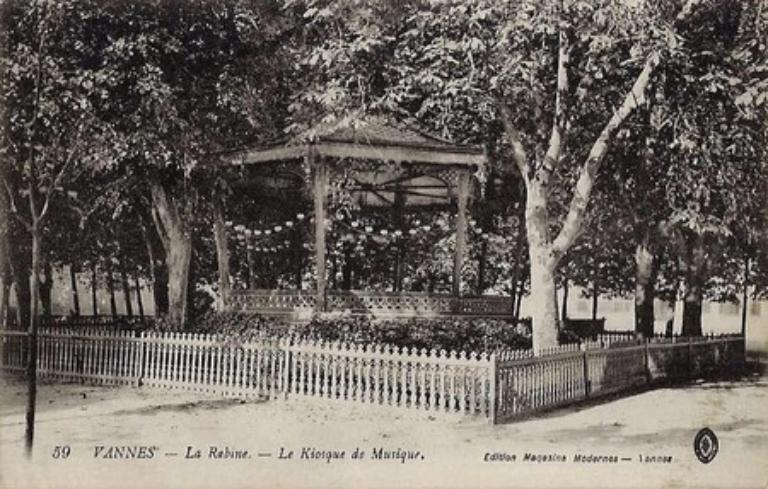Le kiosque à musique de La Rabine a été construit en 1890 d'après des plans de l'architecte vannetais Edmond Bassac. La genèse du projet remonte cependant à 1874 suite à l'arrivée à Vannes de plusieurs régiments militaires (les 28e et 35e régiments d'artillerie ainsi que le 116e régiment d'infanterie). Les musiques de l'École d'artillerie et de l'infanterie sont très tôt détachées à Vannes et ne tardent pas à donner des concerts en plein air pour le plus grand plaisir des Vannetais. Les deux formations musicales jouent les dimanches après-midis sur le tertre en terre de La Rabine, en face du couvent des Carmes déchaussés, prenant ainsi le relais de l'Orphéon, l'orchestre civil de la ville, alors en déclin. Constatant l'engouement des amateurs de musique, la municipalité décide d'améliorer les lieux : en 1875, on plante des fleurs annuelles ; en 1876, on ajoute des massifs de plantes vivaces et des arbustes. La clairière de La Rabine devient rapidement dans le cœur des Vannetais le 'square de la Musique'.