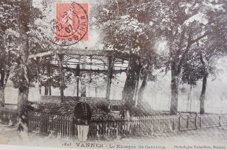 Le 8 mai 1877, le Conseil municipal nomme une commission pour « l'étude de l'établissement, à moins de frais possibles, à l’emplacement d'un kiosque que devront tour à tour occuper les différentes Musiques ». Plusieurs croquis d'un kiosque pour musiciens sont signés par l'architecte-voyer Ernest de Lamarzelle. Le 30 mai, Me Paul-Émile Buguel, rapporteur de la commission, rend compte des conclusions de son groupe. Il fait remarquer que « le kiosque, si kiosque il y a, devra être établi de manière à border à peu près l'allée latérale de la promenade de La Rabine ». Cet emplacement est le seul dans tout Vannes à réunir l'ensemble des conditions indispensables à la bonne appréciation d'un concert : suffisamment d'espace pour accueillir un public nombreux ; des allées pour permettre aux spectateurs de se promener librement pendant l'entracte ; une bonne sonorité déjà éprouvée lors des précédents concerts en plein air ; un nombre d'arbres suffisant pour garantir l'ombre propice à toutes les satisfactions car « le meilleur morceau s'il était accompagné d'une insolation perdrait vite la meilleure part de son charme ». Comme le souligne Me Paul-Émile Buguel « la question d'emplacement étant ainsi fixée, reste le mode de construction à déterminer ». Chose beaucoup moins aisée car « la musique est semble-t-il [la question] sur laquelle il est le plus difficile de se mettre d'accord ». Me Buguel rappelle dans un premier temps les éléments constitutifs d'un kiosque :