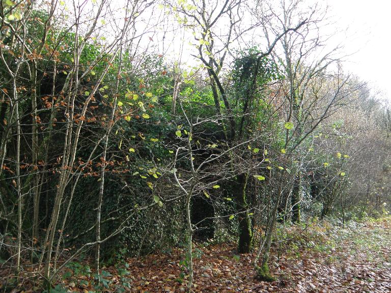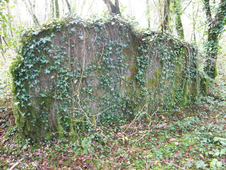 - de l'autre côté de l'ancien chemin d'exploitation, des ateliers de fendeurs alignés sur un longue distance, de part et d'autre d'un bâtiment rectangulaire plus petit, sont présents sur les photographies aériennes des années 1950. Il n'en a été retrouvé qu'un pan de mur, enduit de ciment. Il s'agit très certainement du bâtiment central. Dans le sous-bois, des monticules disposés parallèlement les uns aux autres, de manière régulière, marquent l'emplacement des soubassement des murs des ateliers.