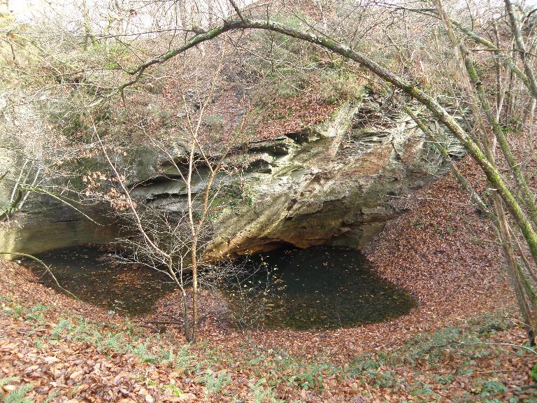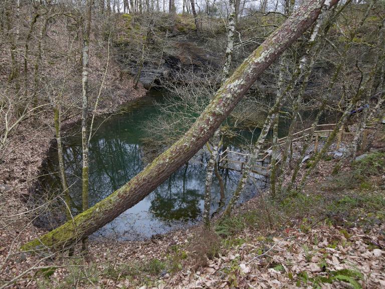 Excavation n°1 : puits à l'extrémité nord-ouest, il présente une forme originale, une sorte de "T" arrondi. Le puits central mesure 5 à 6 mètres de diamètre. Les parois sont toutes verticales. Le fond est rempli d'eau.
