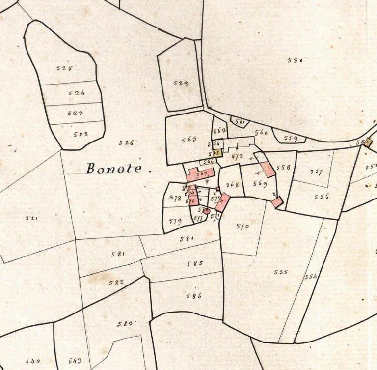 Maison édifiée en 1686, date portée. La porte de droite qui desservait l'étable a été à demi-bouchée au 19e siècle, indiquant probablement le changement de destination de l'édifice en dépendance. Le remplacement de la toiture d'origine en chaume par du fibro-ciment au milieu du 20e siècle a provoqué la modification de la pente de toiture et la reprise du pignon. Un appentis (en ruines en 2015) a été construit en prolongement au 19e siècle.