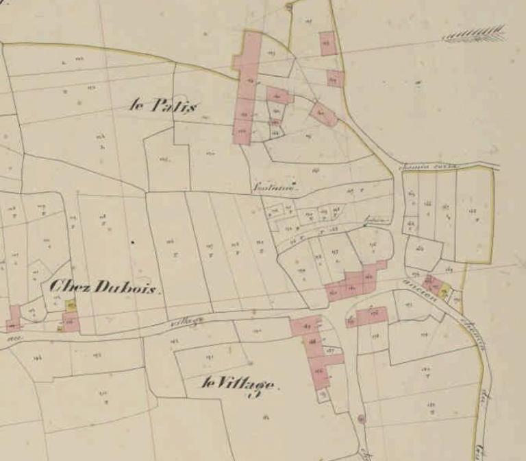 Le hameau se compose de deux parties qui sur le plan cadastral ancien portent deux noms différents, le Patis à l'est composé d'une unique ferme, et le Village à l'ouest. La maison la plus ancienne de l'alignement dans la partie est est datée 1692 (voir dossier). Les autres constructions dans la partie ouest, parfois remaniées, datent du 19e siècle ; l'une est datée 1870 (voir dossier).