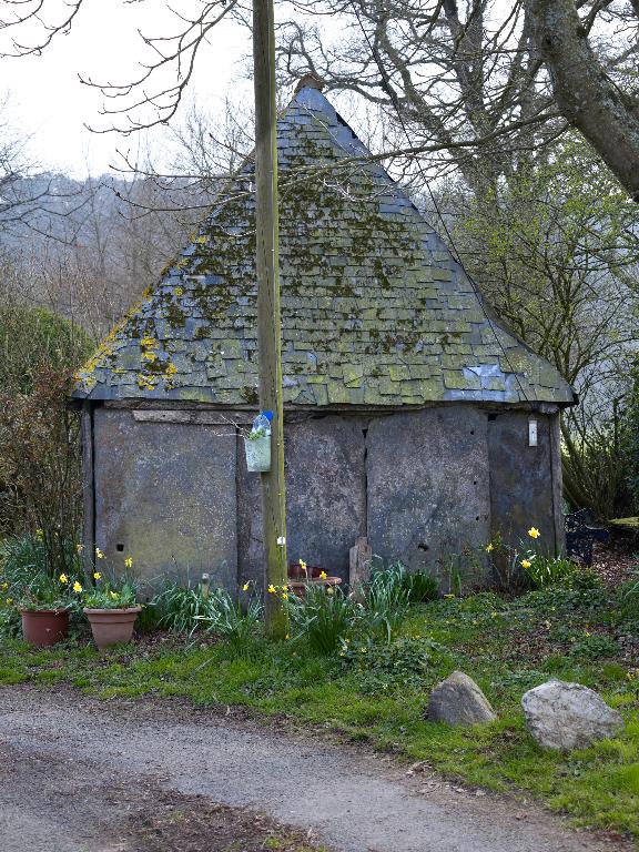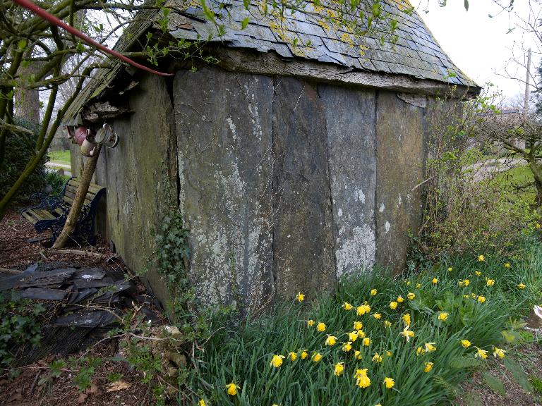Remise ou abri de plan massé construite en palis de schiste insérés dans une préceinte en bois qui sert aussi de sablière pour la charpente à croupes. Une seule ouverture, à l'est, qui consiste simplement en une absence de palis.