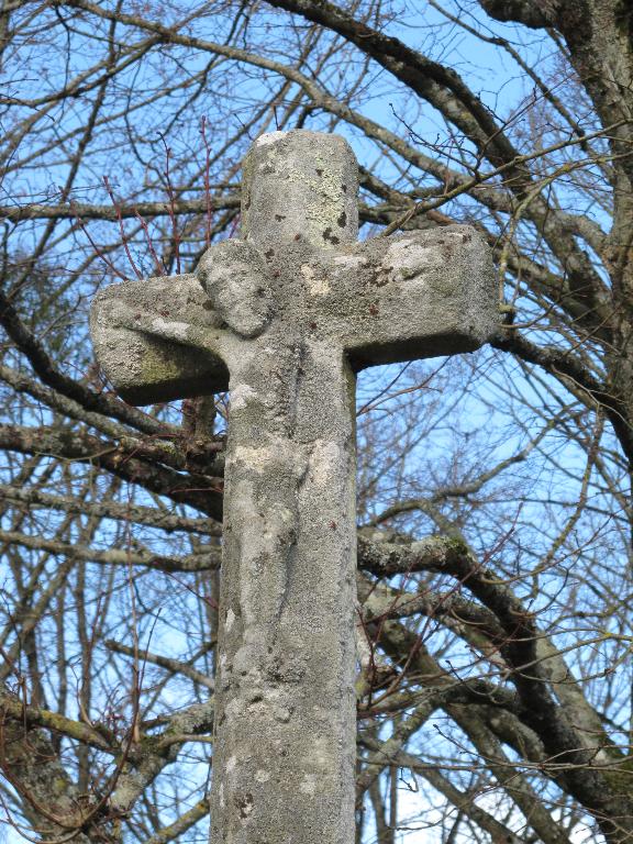 Construite sur le mur d'enclos du presbytère longeant la route, la croix porte la date de 1818 (date lue en 1979, non retrouvée en 2012) : son érection est sans doute la conséquence de la revente du presbytère à la fabrique en 1817. Cependant, la croix qui ne figure pas sur le plan cadastral de 1840, et la représentation du Christ paraissent plus ancienne, peut-être du 17e siècle : il s'agirait alors d'une croix déplacée.