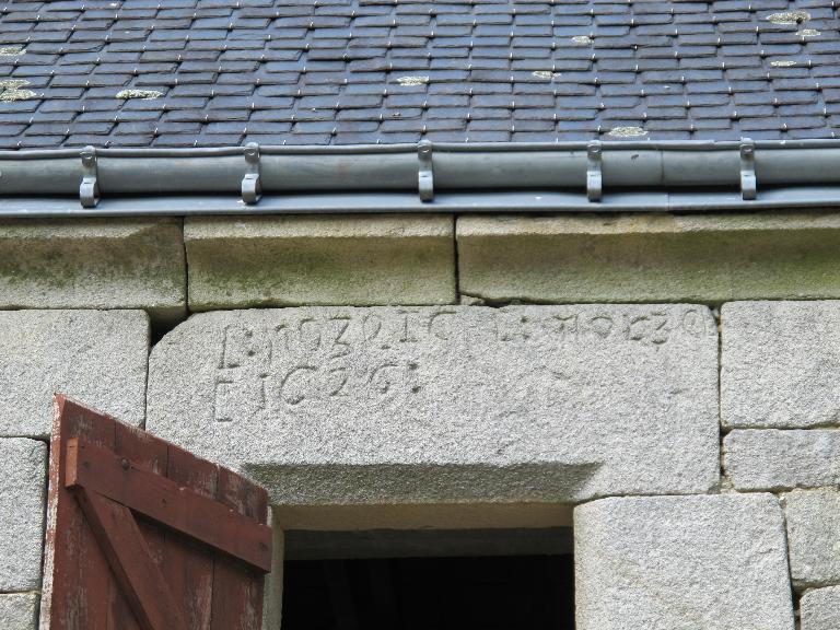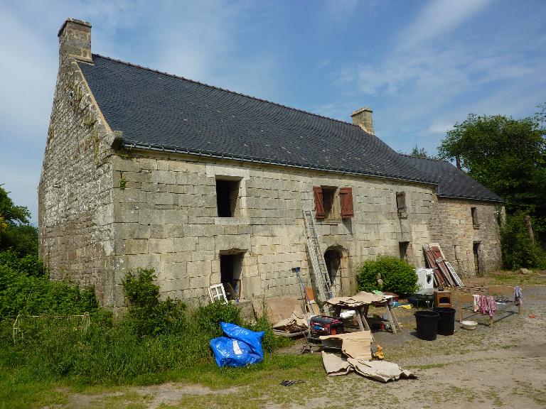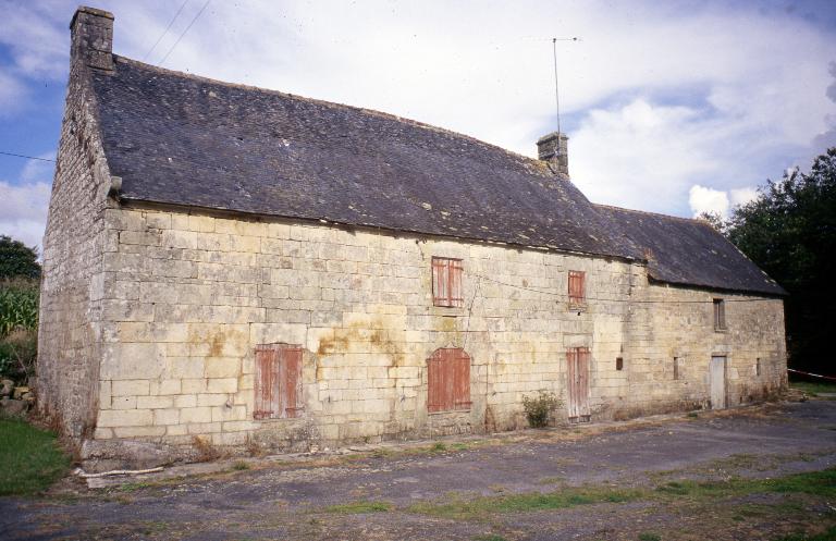 La ferme est construite en pierre de taille de granite (façade du logis et de l'étable), en moellon pour les autres façades. Sa disposition intérieure ne nous est pas connue, puisque aujourd'hui, n'existe plus aucune séparation dans le logis. On peut avancer que la salle se trouvait à l'ouest, avec cheminée dont le linteau a disparu, remplacé par du ciment, piédroits chanfreinés amortis en pyramide et consoles en talon renversé. Contre le mur nord, une porte en demi-niveau à demi-bouchée et une armoire en plein cintre à étagère qui comportait sans doute un saloir. La trace du conduit d'une cheminée disparue contre le mur est correspond peut-être à une disposition d'origine à distribution croisée avec chambre à l'étage (est). Porte de communication entre les greniers de l'étable et du logis.