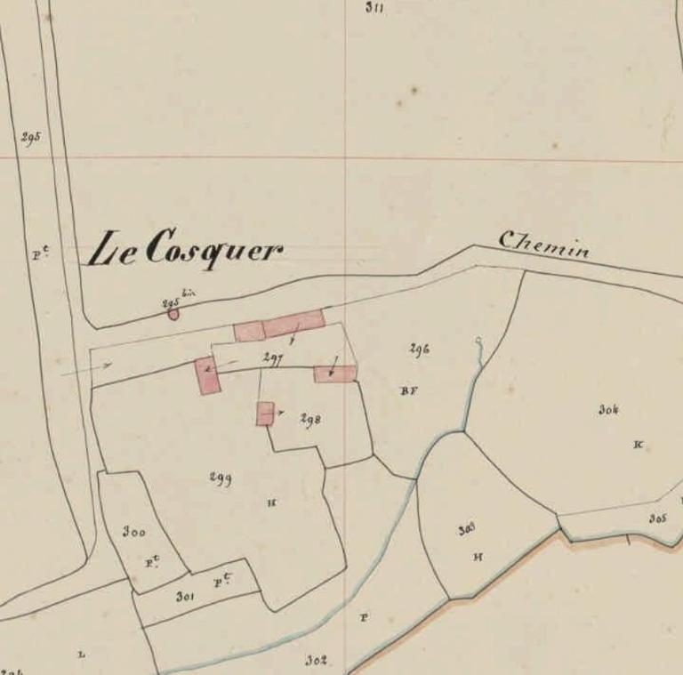 Sur le plan cadastral de 1842, l’ensemble des bâtiments ne forment qu’une seule ferme, composée au moins de trois logis, dont l’un, logis-mixte à deux portes du 18e siècle, était encore intact quoiqu’à usage d’écurie en 1999 : il est aujourd’hui redevenu une habitation : l’enduit a été supprimé, la fenêtre au nord a été agrandie en porte, la toiture a été changée du fibrociment à l’ardoise, et les anciens pignons découverts ont disparu ; mais c’est surtout la clôture de la cour en maçonnerie enduite de blanc qui nuit à la composition de l’ensemble.