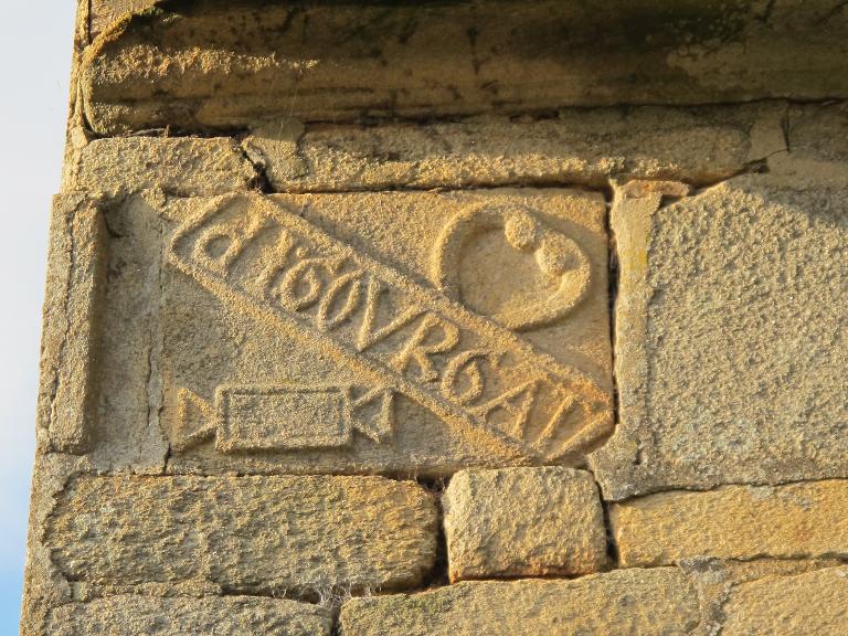 Calice encadré de volutes sculptés sur une pierre entre la porte et la fenêtre de l'étage. Nom du prêtre inscrit dans un cartouche accompagné d'un cœur (?).