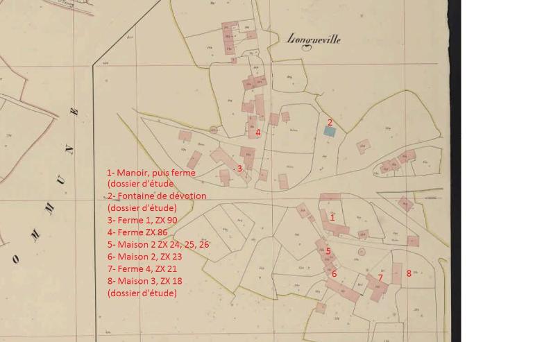 Le village de Longueville est plus important que le bourg lui-même et son évolution, la qualité des constructions conservées (même si la chapelle a été reconstruite au 19e siècle) est sans doute à lier à la proche seigneurie de Guémené. On soulignera particulièrement la conservation du commun qui structure la partie ancienne du village, avec son chêne, arbre remarquable du Morbihan. (C. Toscer)