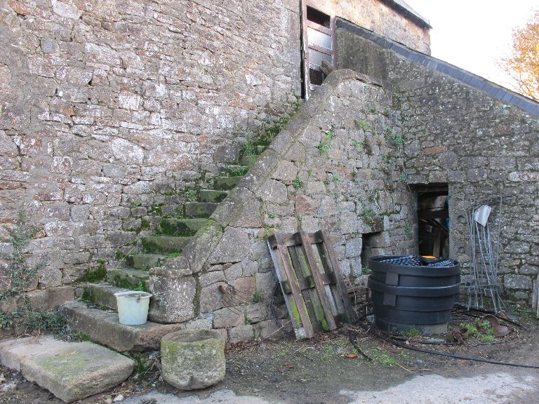 Cette grange-charretterie-cellier qui adopte une forme traditionnellement utilisée en Morbihan, c'est-à-dire à porte charretière en pignon, montre une typologie exceptionnelle avec un étage habitable sur charretterie divisé en deux pièces, au contraire des granges à logement rencontrées habituellement où la pièce habitable occupe la partie opposée au pignon à porte charretière. Bien que dépendante de la ferme située au nord, cette grange pouvait fonctionner de manière autonome, avec une crèche ou étable en appentis adossée au sud : peut-être était-elle destinée aux parents âgés. Une niche à chien est insérée dans la montée de l'escalier, selon une habitude fréquente en Morbihan occidental, mais non rencontré à Locmalo. La rampe de l'escalier, très soignée, participe de la qualité du bâtiment qui montre qu'encore au début du 19e siècle, habiter l'étage revêtait un certain prestige. (C. Toscer)
