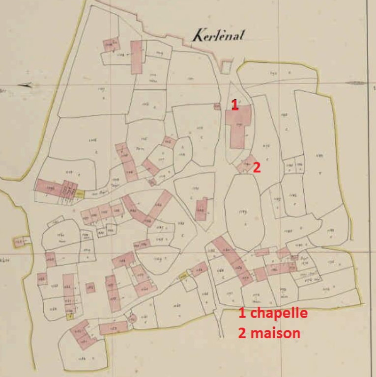 La proximité de cette maison avec la chapelle de Kerlénat, sa construction soignée fait pencher en faveur de la maison du chapelain. Elle pose cependant question : sa faible hauteur exclut la possibilité d'un étage, or la fenêtre de comble avec son appui mouluré est plus soignée et plus grande que la fenêtre de la salle au rez-de-chaussée. Qu'en était-il de l'utilisation de ce comble ? Peut-être l'étage était-il sous charpente, comme le montre un exemple tardif au bourg de Priziac, tout proche. Le pignon découvert brisé au sud est un indice de datation de la 2e moitié du 16e siècle (C. Toscer)