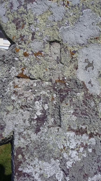 Aspectée vers l'est, elle porte incisée de ce côté, une croix grecque aux bras légèrement pattés. Sur l'autre face du fût, une croix de Saint-André est formée par deux lignes qui se croisent au niveau du point d'intersection des lobes et du fût. A cet endroit, cinq cupules disposées en forme de croix grecque sont visibles, comme symbole des cinq plaies du Christ.