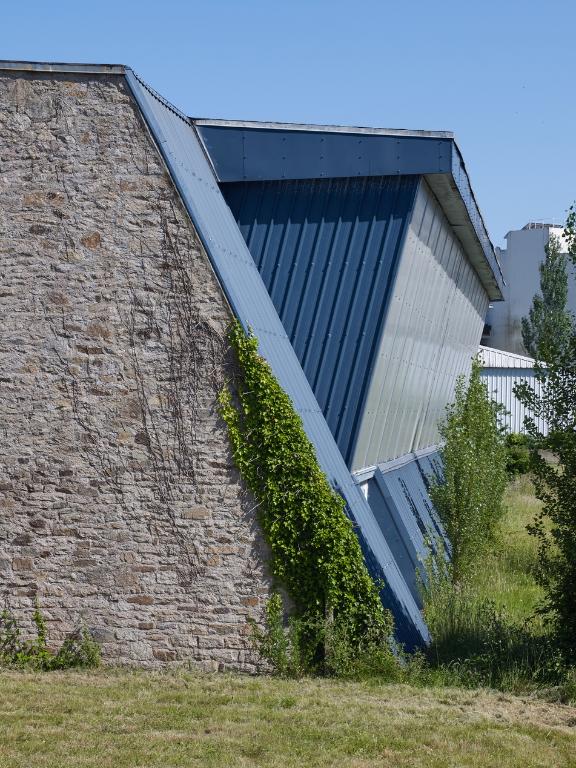 Pignons en maçonnerie de moellons sans enduit extérieur. Ossature métallique.