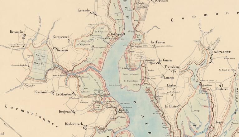 Suite à la fin de l’activité salicole, certaines salines vont être utilisées pour d’autres usages, principalement aquacoles. C’est notamment le cas de la saline de Pen Cadénic au Tour-du-Parc, du Roch'Du à Crac'h, du Brénéguy à Locmariaquer, de Pentès à Surzur, de Lasné, de Ludré et du Pusmen25 à Saint-Armel, de Bénance à Sarzeau et de Rudevent à l’Île d’Arz. En effet, d’après Nicolas Millot26 à partir de 1875, les ostréiculteurs de Bilhervé à l’Île d’Arz transforment ces anciens marais salants en bassins d’affinage pour les huîtres.