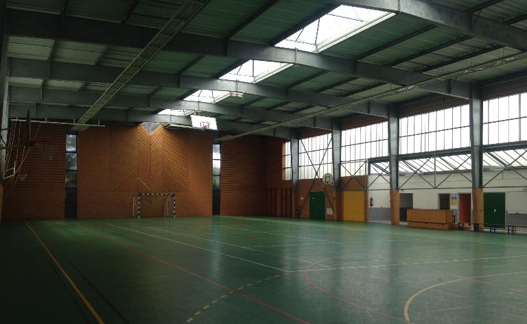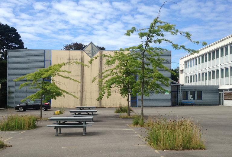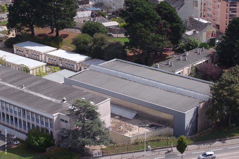 Salle 44 x 24. "Le projet est composé de deux volumes dont l'architecture parallélépipédique n'est pas sans rappeler les bâtiments existants avec un traitement différent et plus contemporain. Le plus grand volume abrite la salle de sport et la hauteur de son acrotère ne dépasse pas celle de l'école. Le plus petit volume qui reçoit les accès publics, les vestiaires sanitaires et la technique, forme la liaison entre la salle et le bâtiment scolaire dont il est une extension. Sa hauteur correspond à celle du rez-de-chaussée existant. Les matériaux utilisés restent sobres, en béton peint, bardages métalliques, grandes surfaces translucides, et leur traitement détermine une esthétique soignée. Son implantation "semi-enterrée", son entourage bâti et végétal font qu'il sera peu visible des rues avoisinantes." (Volet paysager, 1er avril 1996)