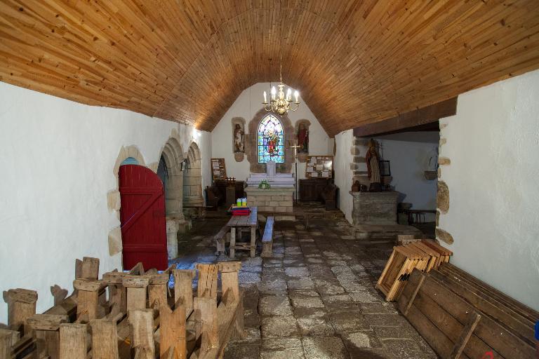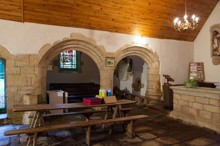À l’intérieur, l’édifice est entièrement chaulé et pavée. Le petit oculus du gâble de la façade occidentale comble une ancienne fenêtre semblant remonter au moins au XIV siècle. À l’angle du chœur et du transept nord, une colonne engagée, masquée par un autel secondaire, indique le départ d’une série d’arcades. La nef et le transept sud sont séparés par deux arcades en berceau à triples voussures s’effaçant dans les fûts des colonnes indiquant une construction dans la seconde moitié du XVIe siècle. Le bénitier contre la première arcade à l’ouest semble être un réemploi d’une colonne octogonale peut-être du transept nord. La baie du chœur est cantonnée de deux niches abritant les statues de Saint-Jean-Baptiste et Saint-Jean reposant sur des consoles à multiples bourrelets et ciselées, surmontées d’une coquille Saint-Jacques.