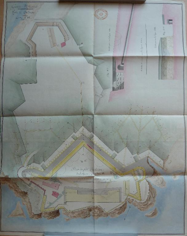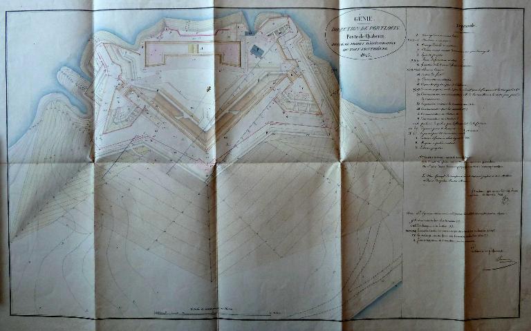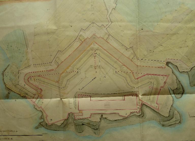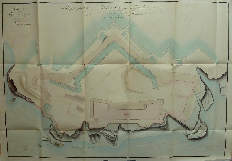 D'après la note ci-dessous [...] on voit que les travaux du Fort Penthièvre, commencés en 1747, furent suspendus au milieu de l'exercice 1748. A diverses époques subséquentes, des modifications et de nouveau projets furent adressés, pour occuper convenablement la hauteur de la Palisse, mais ils ne furent point exécutés.