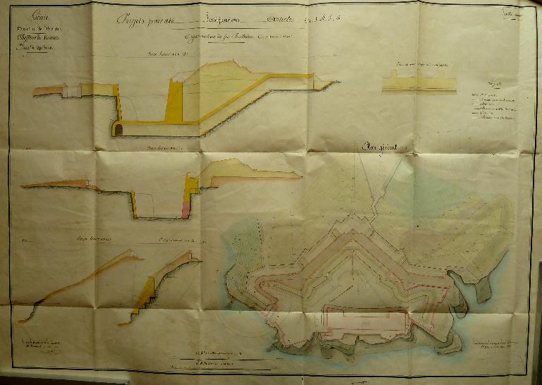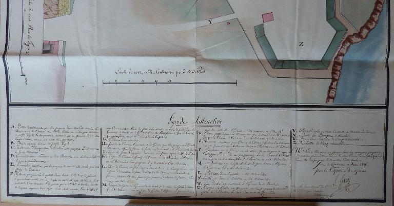 Du reste, en consultant le plan ci-joint, il sera beaucoup facile de se faire une idée juste de cette fortification, qu'en lisant la description la mieux faite et la plus minutieuse, description qui demanderait beaucoup plus de tems pour être lue, qu'il en faut pour avoir une idée précise et complète à l'inspection d'un dessin coté. Les teintes conventionnelles indiquent les parties achevées et celles en projet, les parties en déblais et celles en remblais.