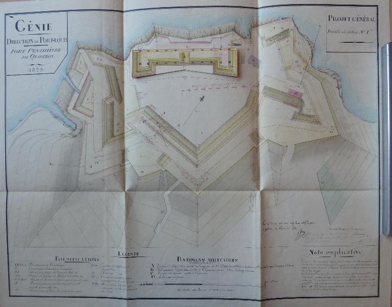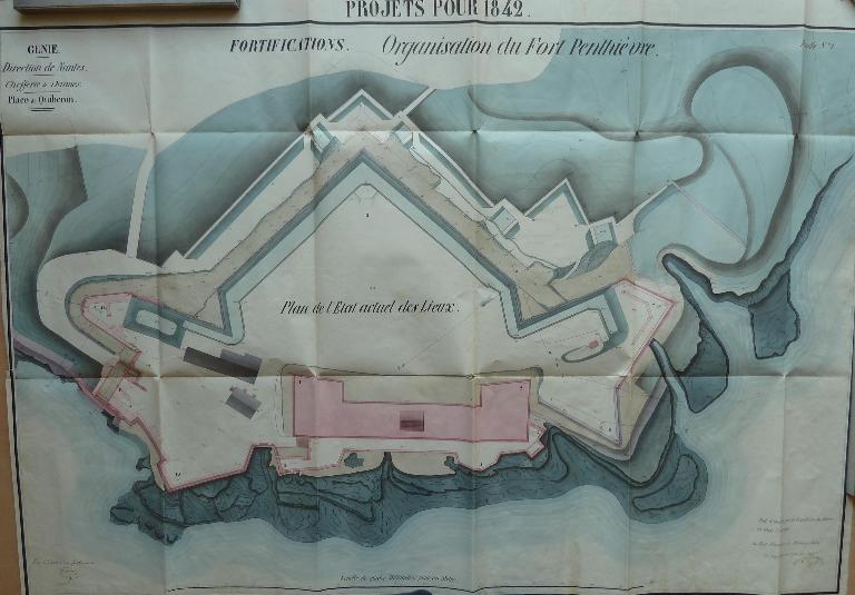 En 1822, un projet fut fait pour modifier les fortifications et construire la caserne défensive. Le Général Haxo fit un second projet du Fort Penthièvre. Enfin, dans ce moment, un nouveau projet est en cours d'exécution. C'est ce projet que représente le dessin ; cependant, quelques modifications seront apportées aux chemins couverts du Fort. Quant au camp et à la lunette (14), on ne s'en est pas encore occupé, bien qu'ils demandent certaines réparations et modifications.