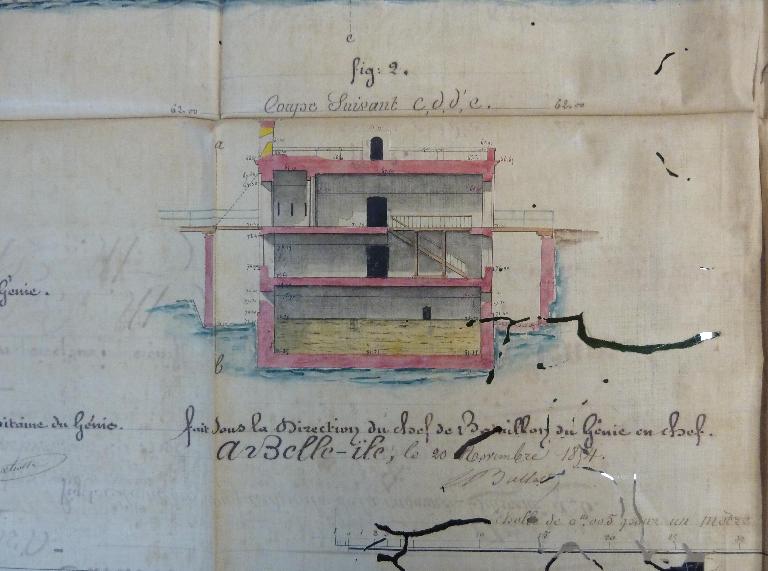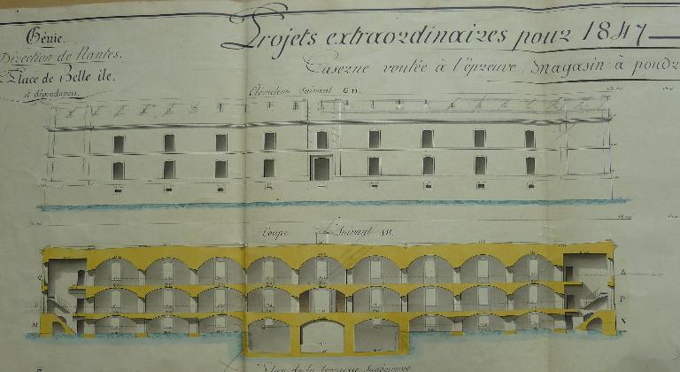 (Service historique de la Défense, département Armée de Terre, Vincennes. Archives du Génie ; Article 21, Objets d'art : 1 VR 122, projets et études pour la construction de casernes et autres bâtiments voûtés à l'épreuve de la bombe, 1746-1874. Capitaine Grillon, Étude sur le casernement de guerre en France, depuis Vauban jusqu'en 1870 (Mémorial de l'officier du Génie), 1874)