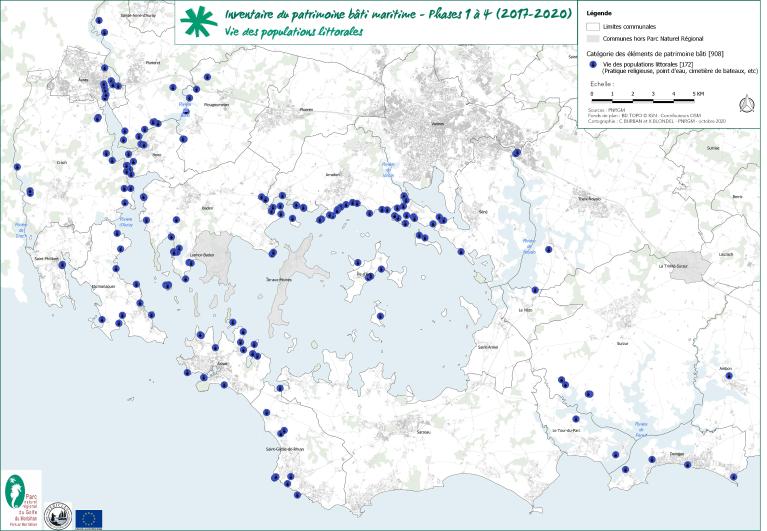 Nombreuses chapelles et églises recensées accueillent une fois par an un Pardon (Saint André à Crac'h, Notre Dame de Becquerel au Bono, Notre Dame de Penmern à Baden, etc.) et/ou des ex-votos marins (chapelle de Locmiquel et de Mériadec à Baden, Sainte Avoye à Pluneret, etc.). Il peut s’agir de tableaux, de gravures, de maquettes de bateau ou de dessins. Ces ex-votos sont déposés par les marins ou leurs familles afin de solliciter la protection d'un.e saint.e ou en remerciement de la protection dont les marins ont bénéficié lorsqu’ils étaient en mer.