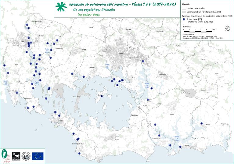 Les puits inventoriés sur le littoral offraient aux marins un point de ravitaillement en eau douce issue de nappes souterraines. A l'instar des fontaines, ces points d'eau montrent une grande diversité de typologies. Certaines cavités sont surmontées d’une structure quadrangulaire à fronton plein triangulaire et possèdent des assises latérales en pierre (Baden, Suscinio et Beg Lann à Sarzeau, Le Passage à Saint-Armel), d’autres sont coiffés d'un dôme conique (Damgan) ou quadrangulaire (île Renaud, Baden). Quelques uns sont couverts par une voûte en moellon (puits de Pomper à Baden) ou par une voûte constituée de blocs de granite appareillés (puits de Pen er Men à Arradon). L’ensemble est généralement en granite maçonné. A Séné, la cavité est seulement aménagée d'une paroi en pierre sèche et ne comporte pas de structure couvrante. A la caserne de douaniers de Suscinio, la cavité est également constituée uniquement d'une paroi en pierres de taille jointoyées. Les puits recensés présentent différents états de conservation: certains sont envahis par la végétation et/ou sont fortement dégradés (Lasné, Néret et Penvins à Sarzeau, Bailleron à Saint-Armel), d'autres ont été remaniés (Pointe de Penvins).
