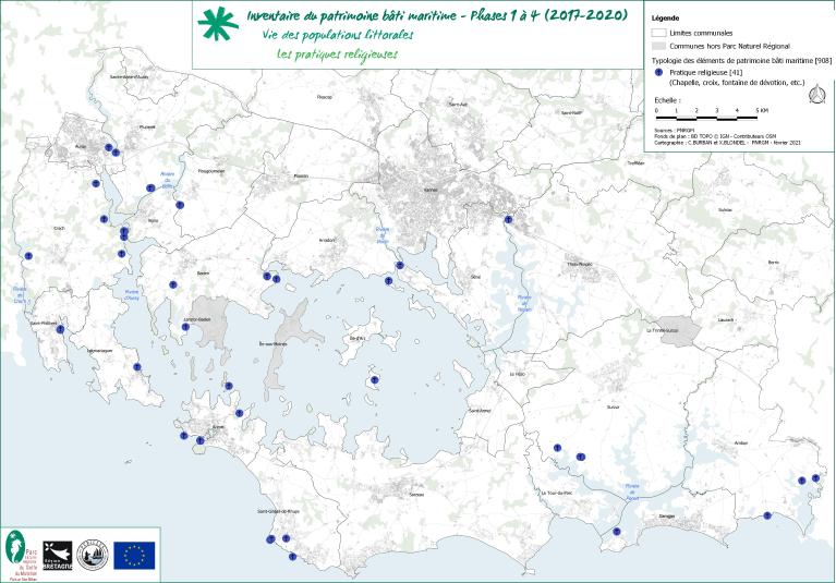 A Damgan, Sarzeau, Saint-Philibert, Arzon, Ambon, Noyalo, Surzur, Pluneret, Le Bono, Baden, Crac'h et sur l’île de Boëdic des chapelles ou églises ont été inventoriées. Une majorité de ces édifices religieux date du XVIIe siècle : la chapelle Saint André à Crac'h, la chapelle Saint-Mamers à Ambon, l'église Saint Pierre à Pénerf (Damgan), l’église paroissiale de Saint-Philibert ou encore la chapelle de l’île de Boëdic (Séné)✣ à l’entrée de la rivière de Vannes, utilisée comme amer pour la navigation. La chapelle de Saint-Tugdual à Ambon, de Saint-Martin à Sarzeau ainsi que probablement celle de Mériadec à Baden datent du XVIIIe siècle; la chapelle de Roshnaro à Crac'h et celle du Croisty à Arzon, du début du XIXe siècle (sur les bases d’un édifice attesté du XVIIe siècle pour celle du Croisty).