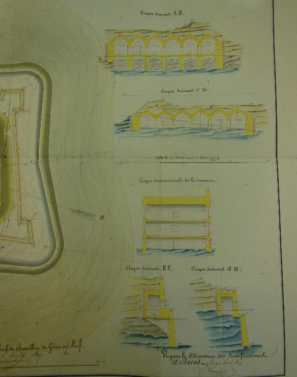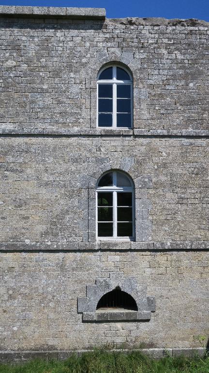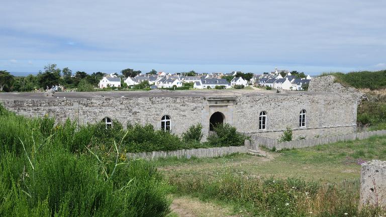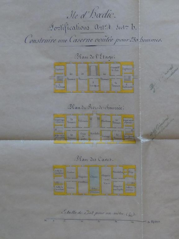 La caserne du fort d'Hoedic est construite d'après les plans-types de caserne voûtée à l'épreuve établis par le Comité des fortifications en 1843 et 1845 d'après les propositions du capitaine Belmas.