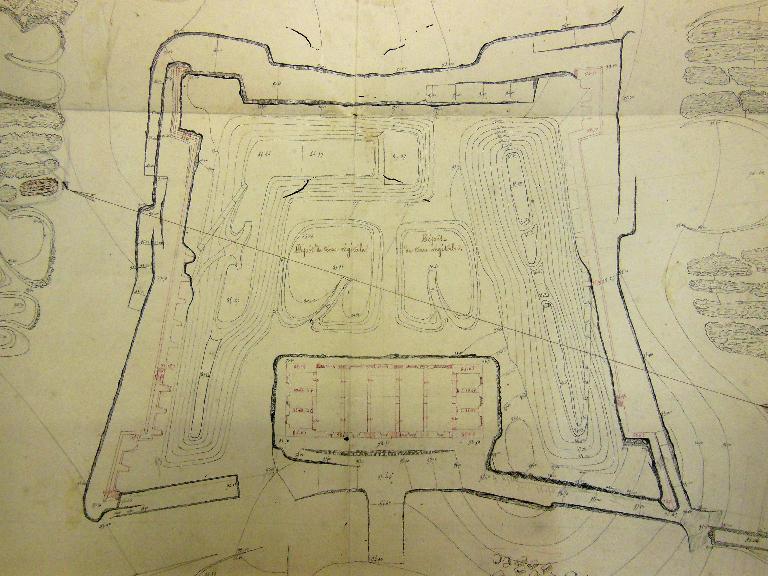 Les locaux du sous-sol sont surtout dédiés à la logistique alimentaire : magasins aux vivres, boulangerie, cuisine, cantine. La citerne alimentée par le recueil des eaux pluviales en terrasse occupe la travée centrale. Les salles de police sont également au sous-sol, ainsi que le magasin d'artillerie et une forge. Des latrines à fosses, séparées pour les officiers et la troupe, sont aménagées sous une voûte dans la contrescarpe de la partie nord du fossé de la caserne. La communication entre le fond du fossé de la caserne et le terre-plein de la cour du fort s'effectue au moyen de deux escaliers droits.
