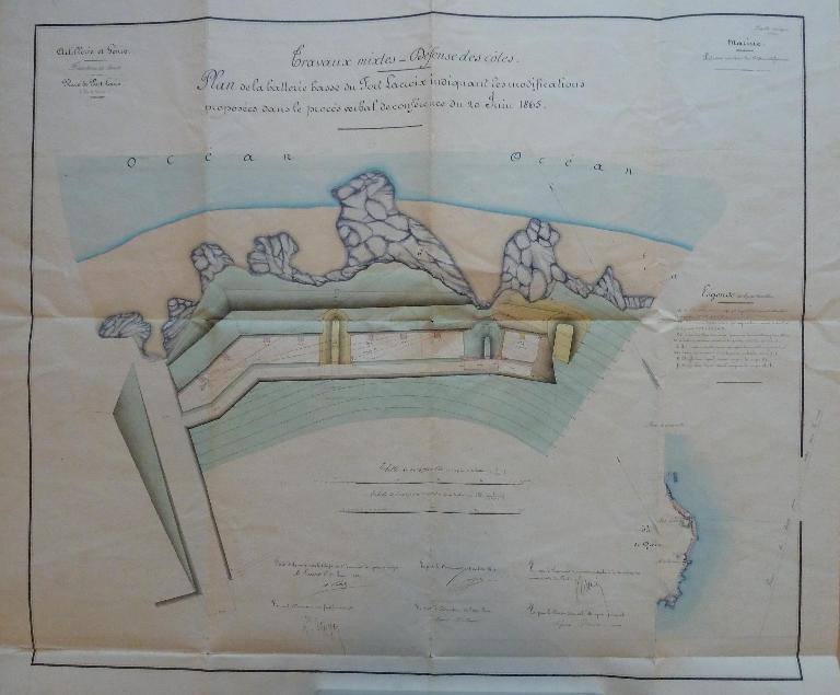 • Service historique de la Défense, département Armée de Terre, Vincennes. Archives du Génie ; Article 12, Avis du Comité : 1 VK 577. Commission de défense des côtes : tableau faisant connaître le nombre, l'armement et le classement des batteries de côtes des 1er (Cherbourg), 2e (Brest), 3e (Lorient), 4e (Rochefort) et 5e (Toulon) arrondissements maritimes, de la Corse, de l'Algérie et des colonies, 1860-1862.