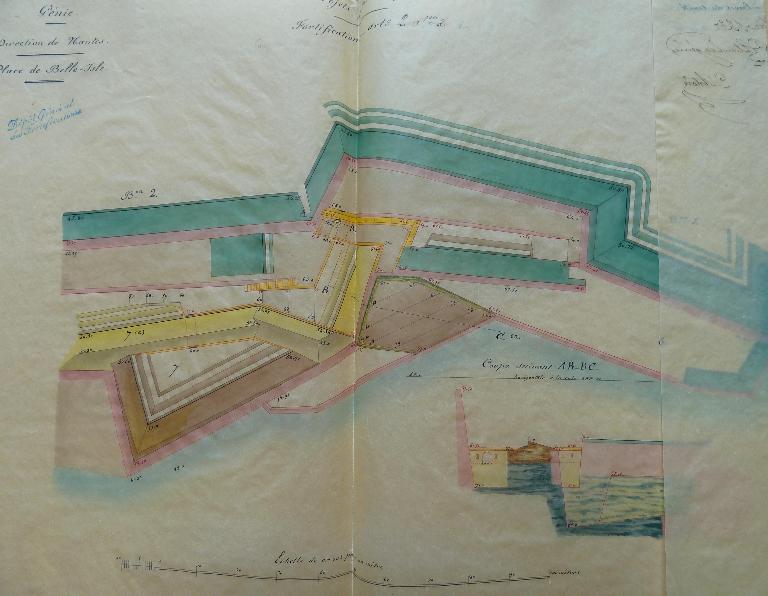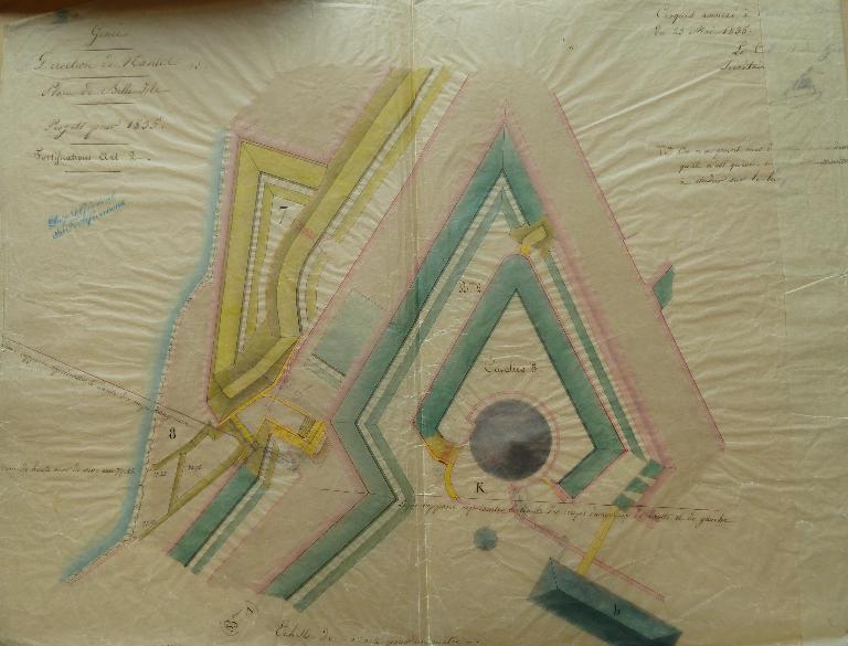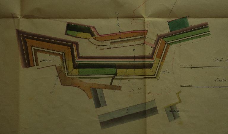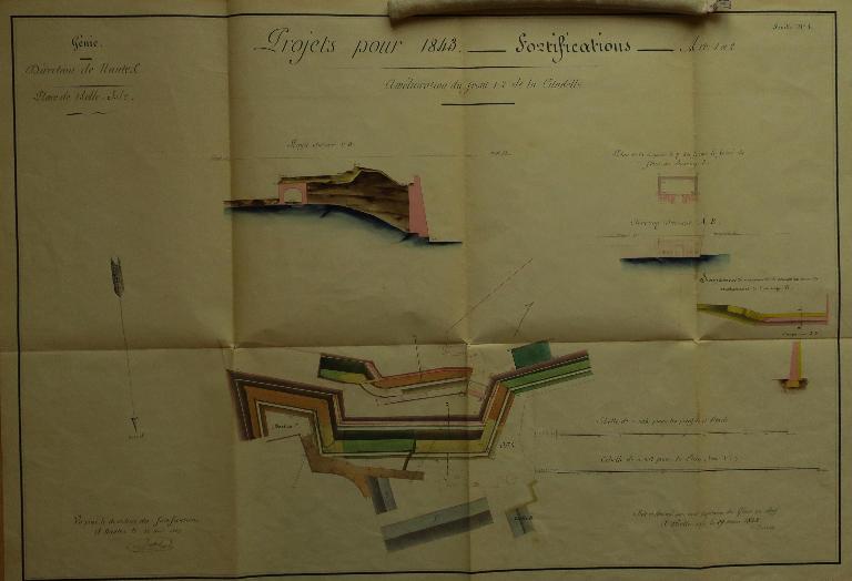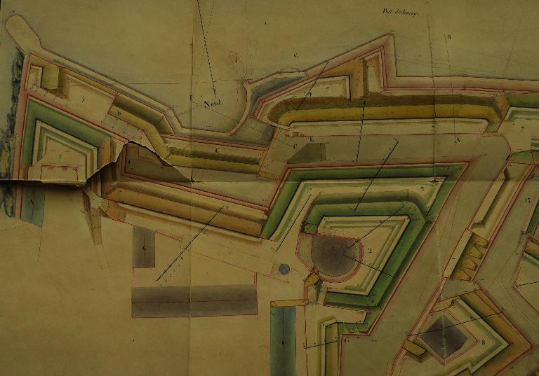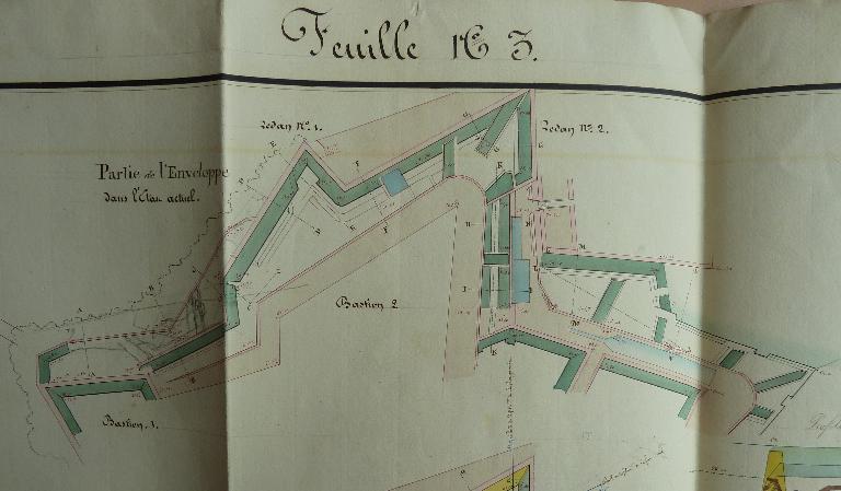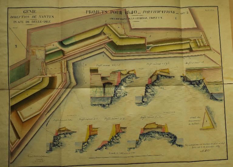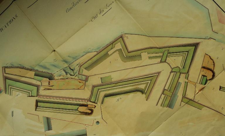 Les fronts sud de la citadelle, partie la plus exposée, lieu de la brèche lors du siège de 1761, font l'objet de nombreux projets de remaniement durant la première moitié du 19e siècle. La nécessité de couvrir les escarpes des bastions 1 et 2 et de leur courtine par des terrassements est alors reconnue, de même que celle de la mise en sûreté de la trop accessible fausse-braie existant devant le front 1-2.