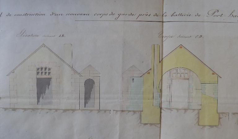 L'agrandissement du bassin de Port Haliguen dans les années 1840 entraîne la destruction du corps de garde de la batterie située immédiatement à l'est du port. Les Travaux Publics doivent donc reconstruire à leurs frais un nouveau corps de garde dessiné par le génie. Ce corps de garde est remis à l'autorité militaire en juillet 1845. A cette date, l'abandon de la batterie de Port Haliguen est déjà décidée par la "Commission mixte d'armement des côtes de la France, de la Corse et des îles" de 1841.