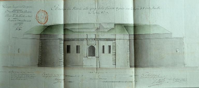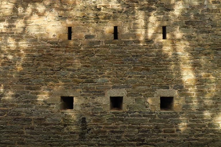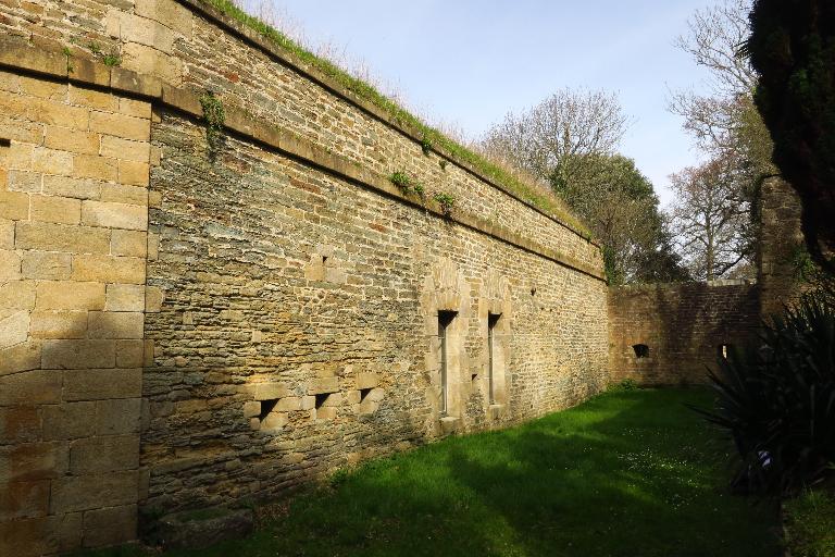 L'élévation côté campagne est plus sobre. Hormis deux fenêtres de la travée de gauche, les seules ouvertures sont des créneaux de tir et des évents d'aération. Les deux fenêtres, visibles sur les plans de 1810, ont été un temps bouchées et remplacées par des créneaux de tir. Elles ont été ouvertes depuis les années 1970.