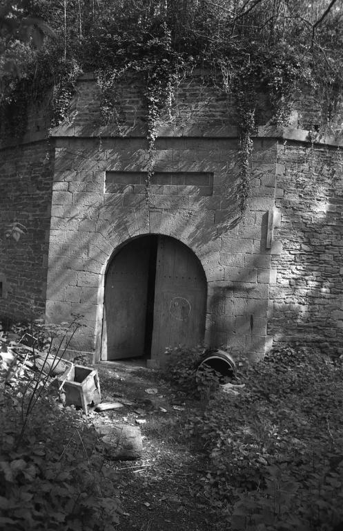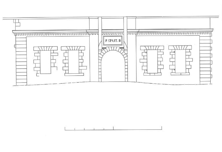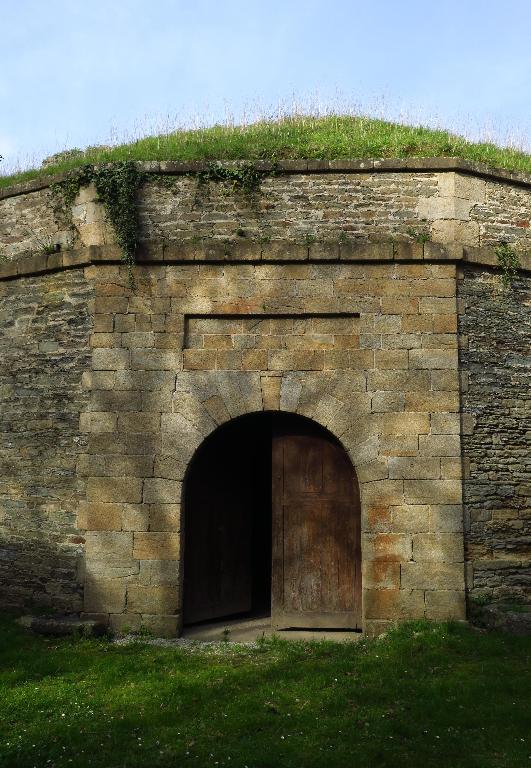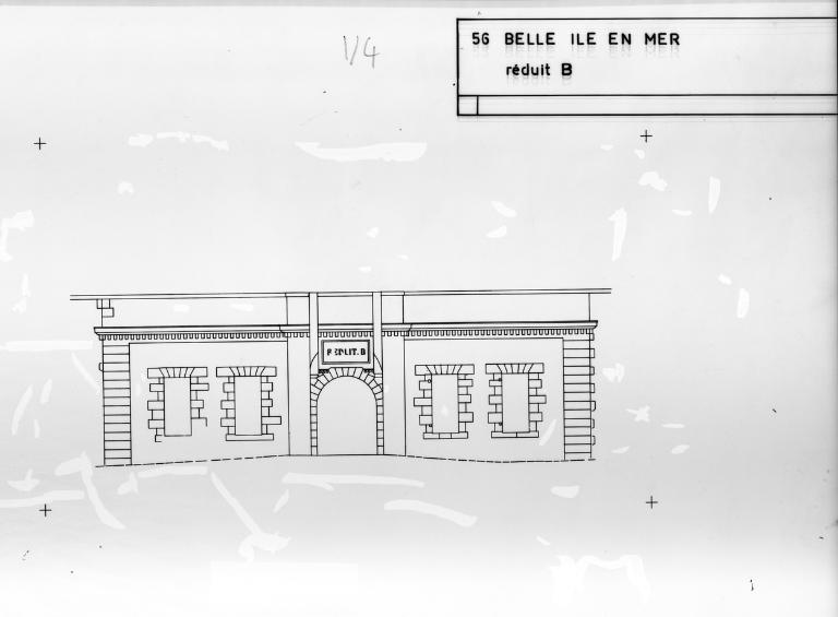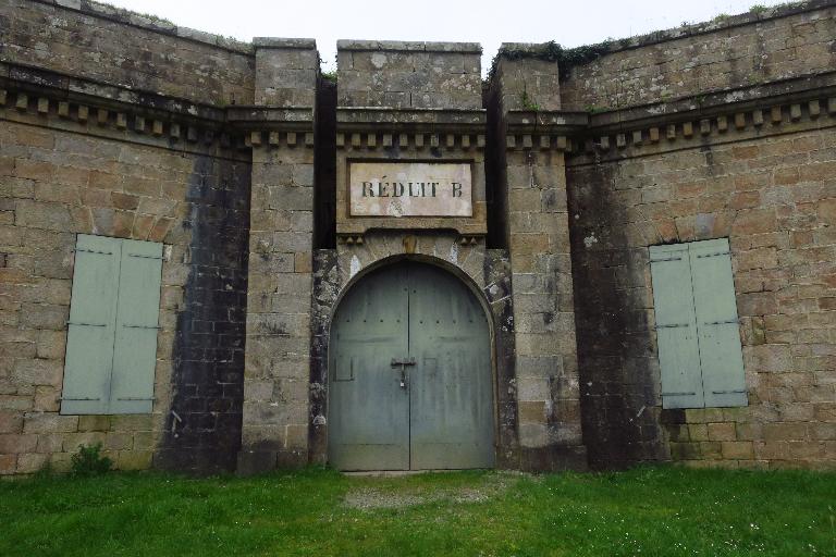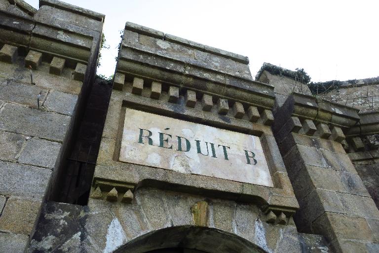 L'élévation côté ville aligne deux groupes de deux fenêtres de part et d'autre de la porte. Les maçonneries de la partie centrale sont entièrement en granit, les murs d'aile sont en moellons de schiste avec chaînages en granit. Le décor est constitué d'une corniche à denticules et d'un cartouche dans lequel l’inscription "Réduit B" est gravée dans une dalle de calcaire.