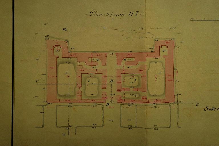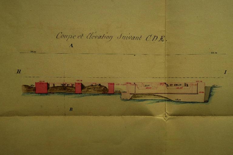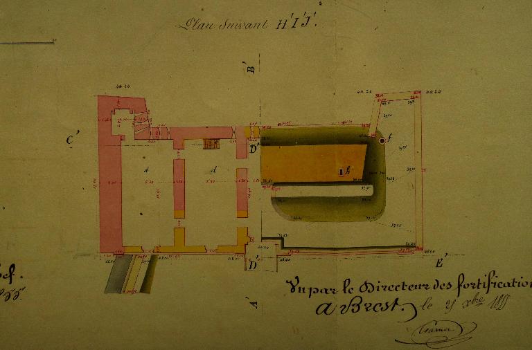 Le bâtiment de 35 mètres en façade de gorge se compose de cinq travées voûtées juxtaposées, et de deux petites pièces correspondant aux bastionnets prévus en façade frontale. La travée centrale est un passage devant initialement desservir l'ouvrage C. Elle est munie d'une large porte à chaque extrémité. Les quatre autres travées sont similaires entre elles, hormis celles placées immédiatement de part et d'autre du passage central, qui présentent dans un angle un arrondi correspondant au logement de l'escalier non construit. Les portes de communication entre les travées sont actuellement murées en parpaings.