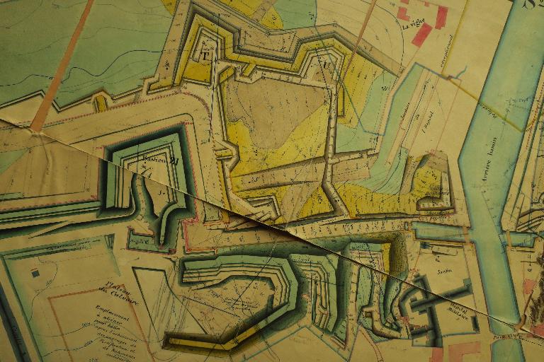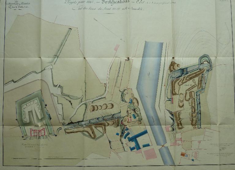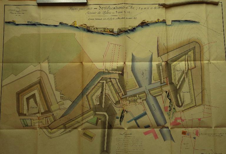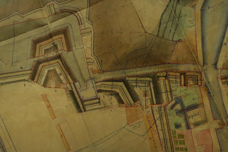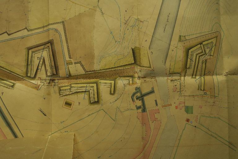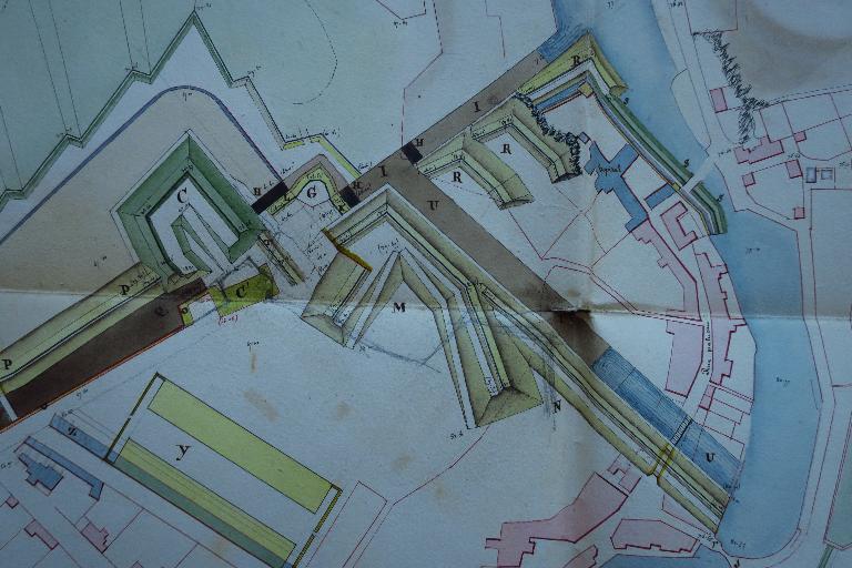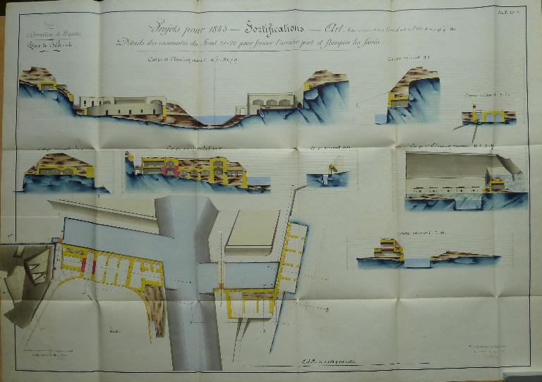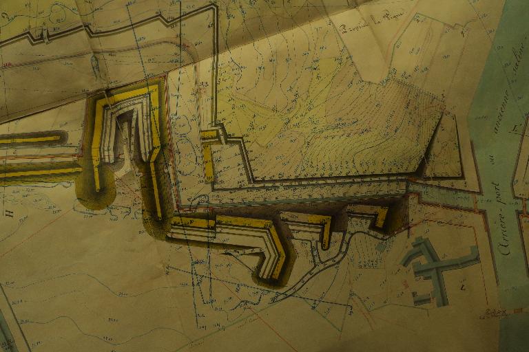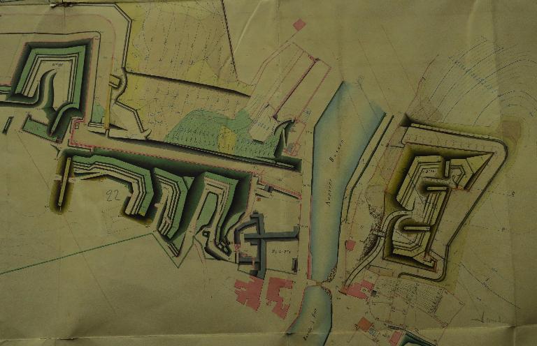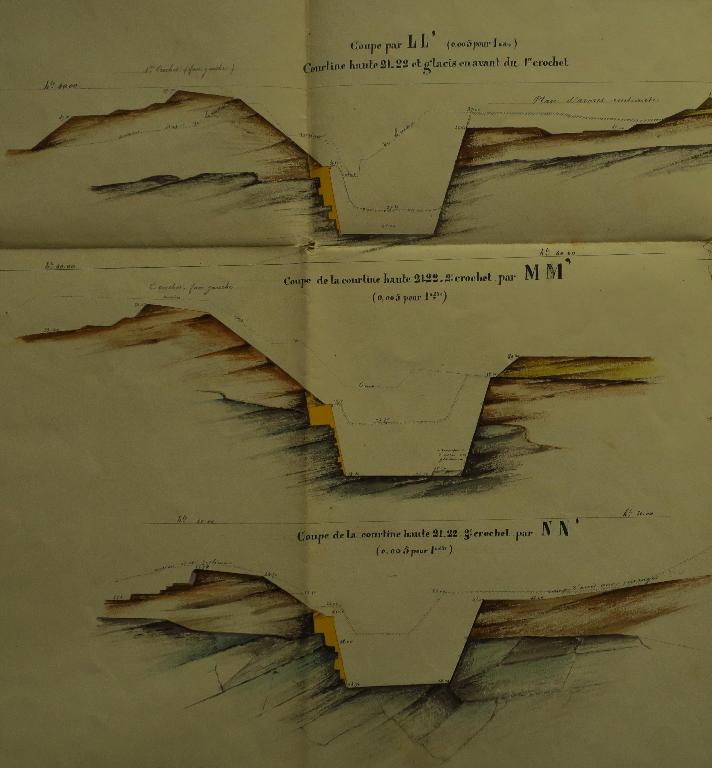 Les travaux commencent à l'occasion de la crise diplomatique européenne de l'été et de l'automne 1840. Le creusement du fossé est alors bien avancé, ainsi que l'établissement des terrassements. Une grande traverse avec abri voûté est commencée dans le jardin de l'hôpital. Mais les travaux sont suspendus et ne reprennent que dans les années 1860. La courtine 21-22 est achevée sous sa forme actuelle en 1865-1866.
