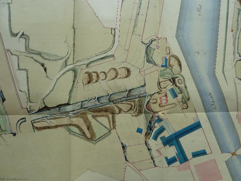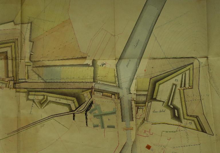 Dans les années 1820 et 1830, les ingénieurs envisagent une coupure qui relierait le bastion 21 au bassin du port dans la direction de la citadelle. Cette option n'est plus retenue à partir de la fin des années 1830, car elle nécessiterait de raser une partie du quartier de la ville situé le long du bassin. Les projets étudiés dans les années 1840, 1850 et 1860 adoptent un tracé reliant le bastion 21 au bassin de la Saline dans les environs de l'hôpital militaire. Ce tracé rend nécessaire la construction d'un ouvrage sur la hauteur de Beausoleil afin d'empêcher la courtine d'être prise en enfilade. La jonction entre les deux ouvrages à travers le bassin est délicate. Il est notamment envisagé de creuser des bassins perpendiculaires à la Saline, flanqués depuis des casemates.