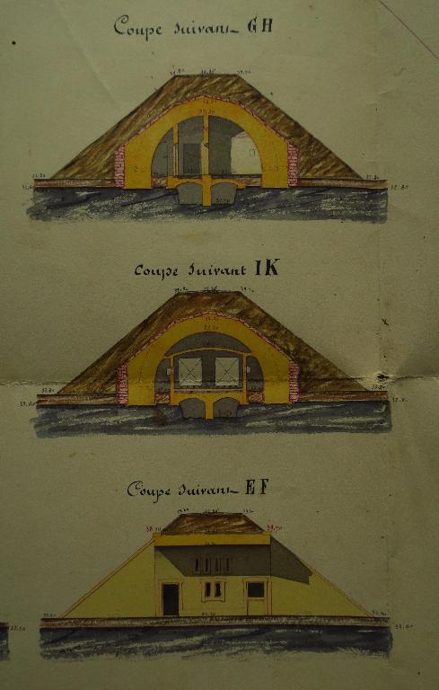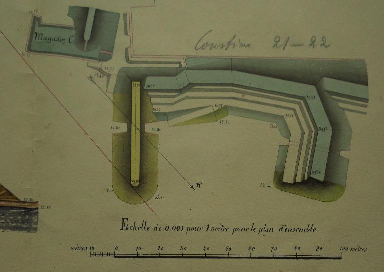 Les arrières de la jonction entre le bastion 21 et la courtine 21-22 sont admis depuis 1847 comme l'emplacement d'un magasin à poudre. Le Comité des fortifications donne consigne en 1866 de construire une traverse terrassée à cet endroit et d'y loger ce magasin à poudre. Le projet présenté pour l'exercice 1868-1869 se base sur le plan-type de 1867. Il est toujours en projet en 1870.